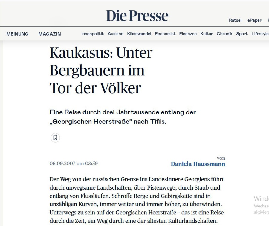 Eine Reise durch drei Jahrtausende entlang der "Georgischen Heerstraße" erschienen in der österreichischen Tageszeitung "Die Presse".